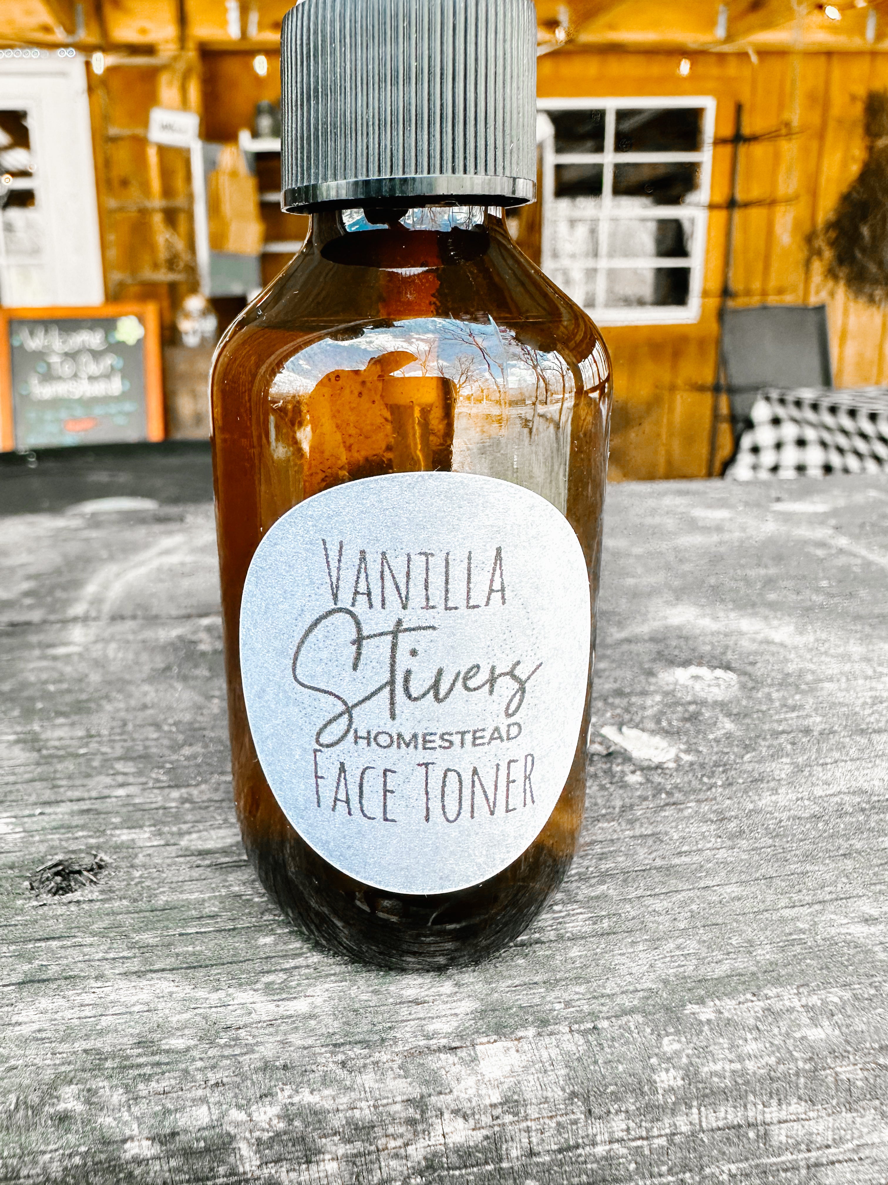 Our face toner is made from witch hazel, organic vitamin E oil, and vanilla essential oil. It makes your skin feel wonderful, while also tightening pores, softening skin, and reducing redness and irritation. After cleansing your face with your cleanser of choice, spray toner on a pad/cotton ball, or spray directly onto your face and neck. Let air dry, and then moisturize with our calendula salve.